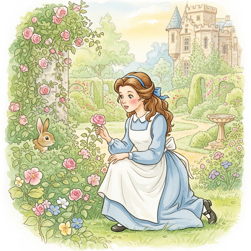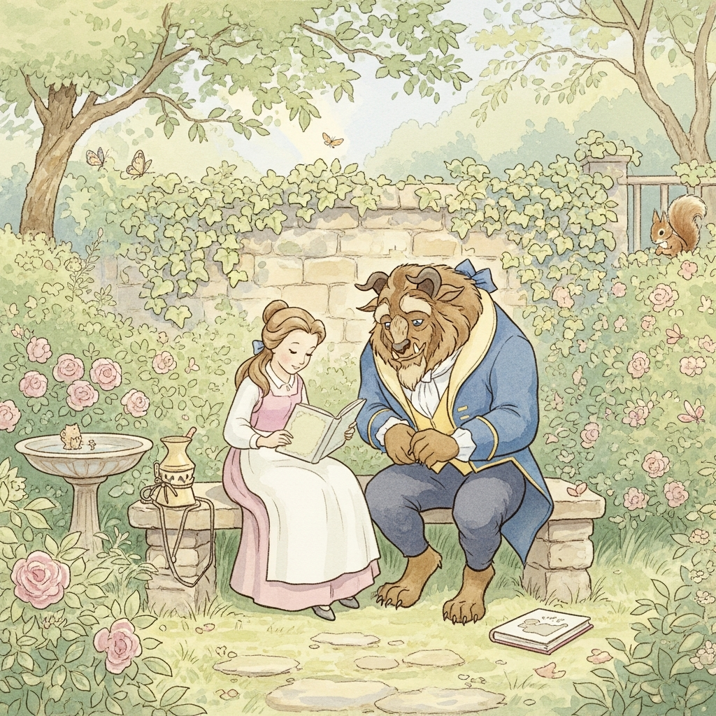 Belle found the castle enchanting. The furniture could talk, and the library was huge! Slowly, she began to see the Beast was not mean at all.