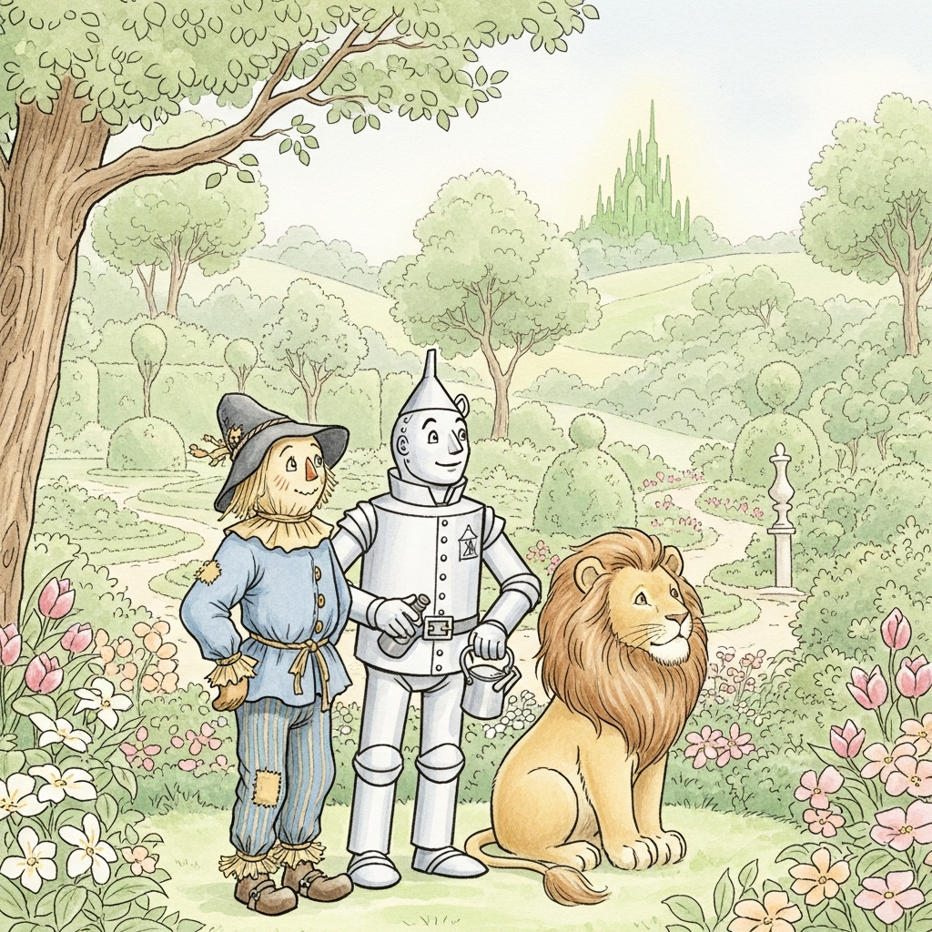 The Emerald City was shining! The Wizard appeared as a giant head. He told them: "Defeat the Wicked Witch, and I will grant your wishes."