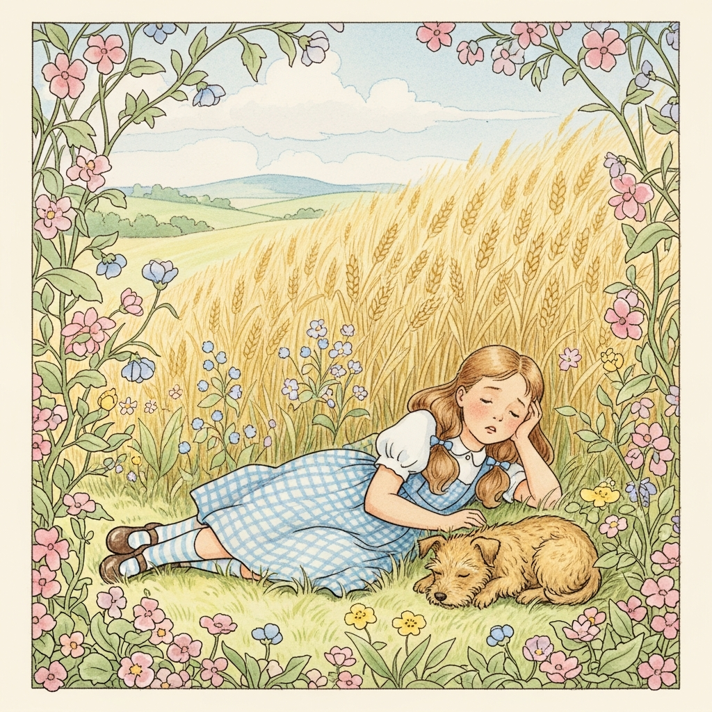 On her way, she met a Scarecrow who wanted a brain. He joined her on the road, hoping the Wizard would grant his wish too.