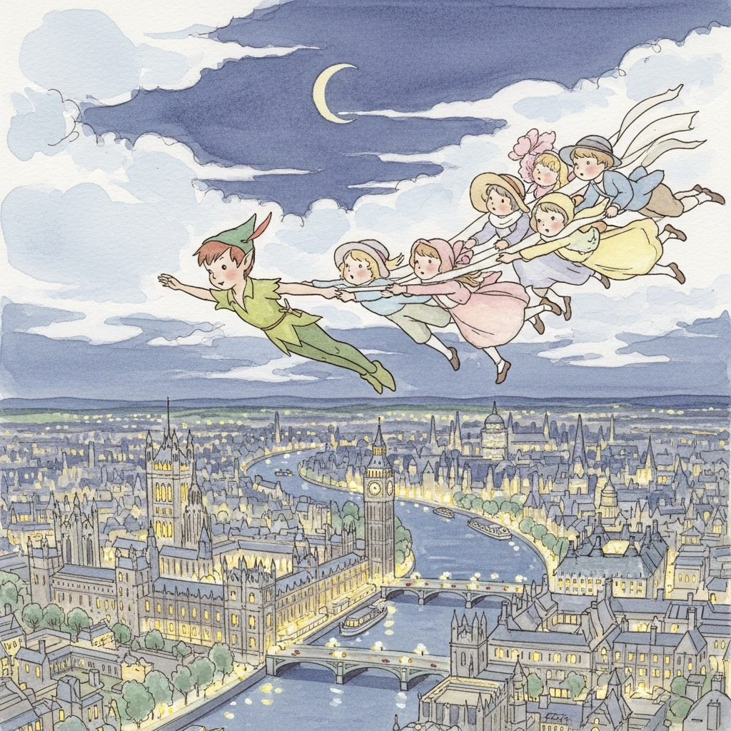 With a bit of fairy dust, they soared out the window! "Second star to the right and straight on till morning!" they cheered over the sleeping city.