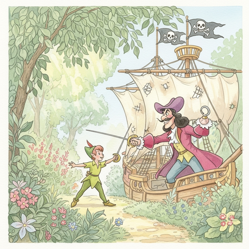 Peter and Hook fought a great duel on the ship's deck. Peter was fast and brave, while Hook was clumsy and terrified of the ticking crocodile.