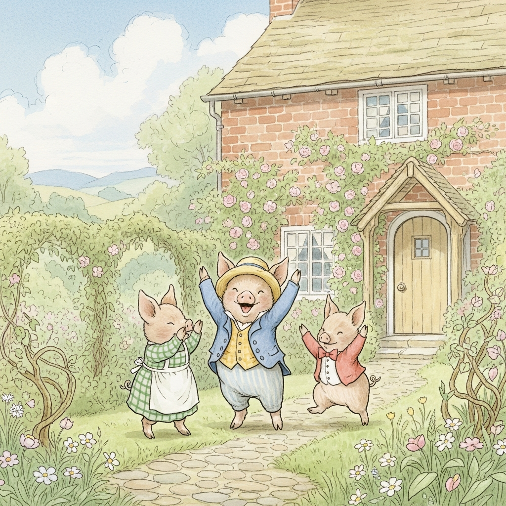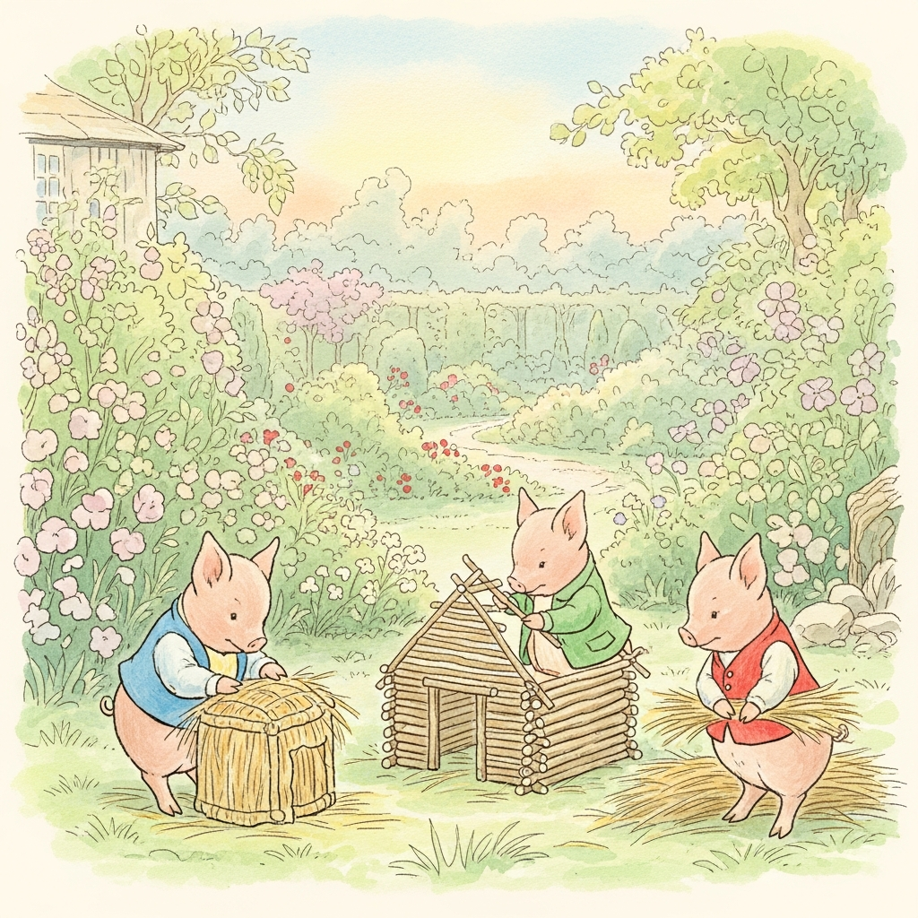 The first pig was lazy. He built his house of straw because it was quick and easy. "Now I can play all day!" he sang happily.