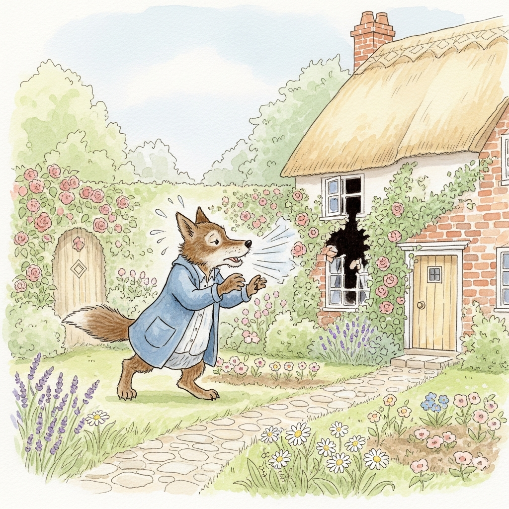 The wolf huffed and puffed at the brick house, but it didn't move! Furious, he climbed to the roof to go down the chimney.