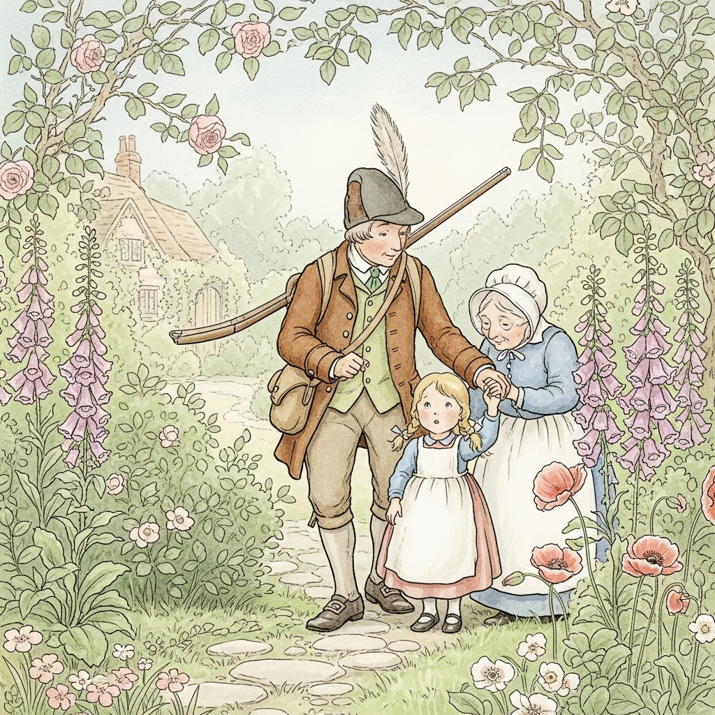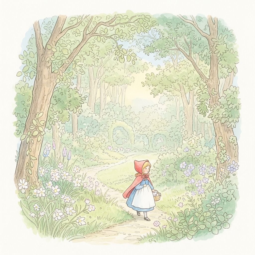 Little Red Riding Hood set off to visit her grandmother with a basket of cakes. "Stay on the path!" her mother warned as she waved goodbye.
