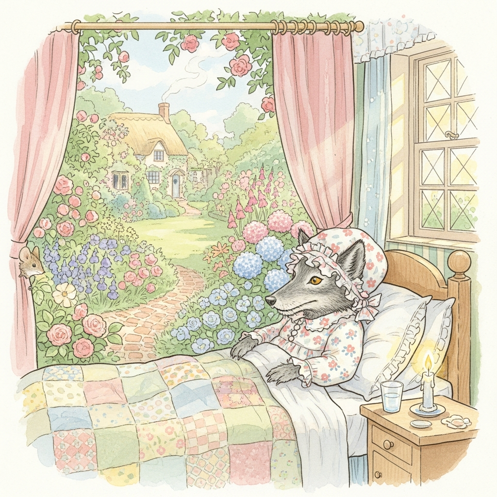 The Wolf reached the house and locked Grandma in the cupboard. He put on her nightgown and cap, waiting for the little girl to arrive.